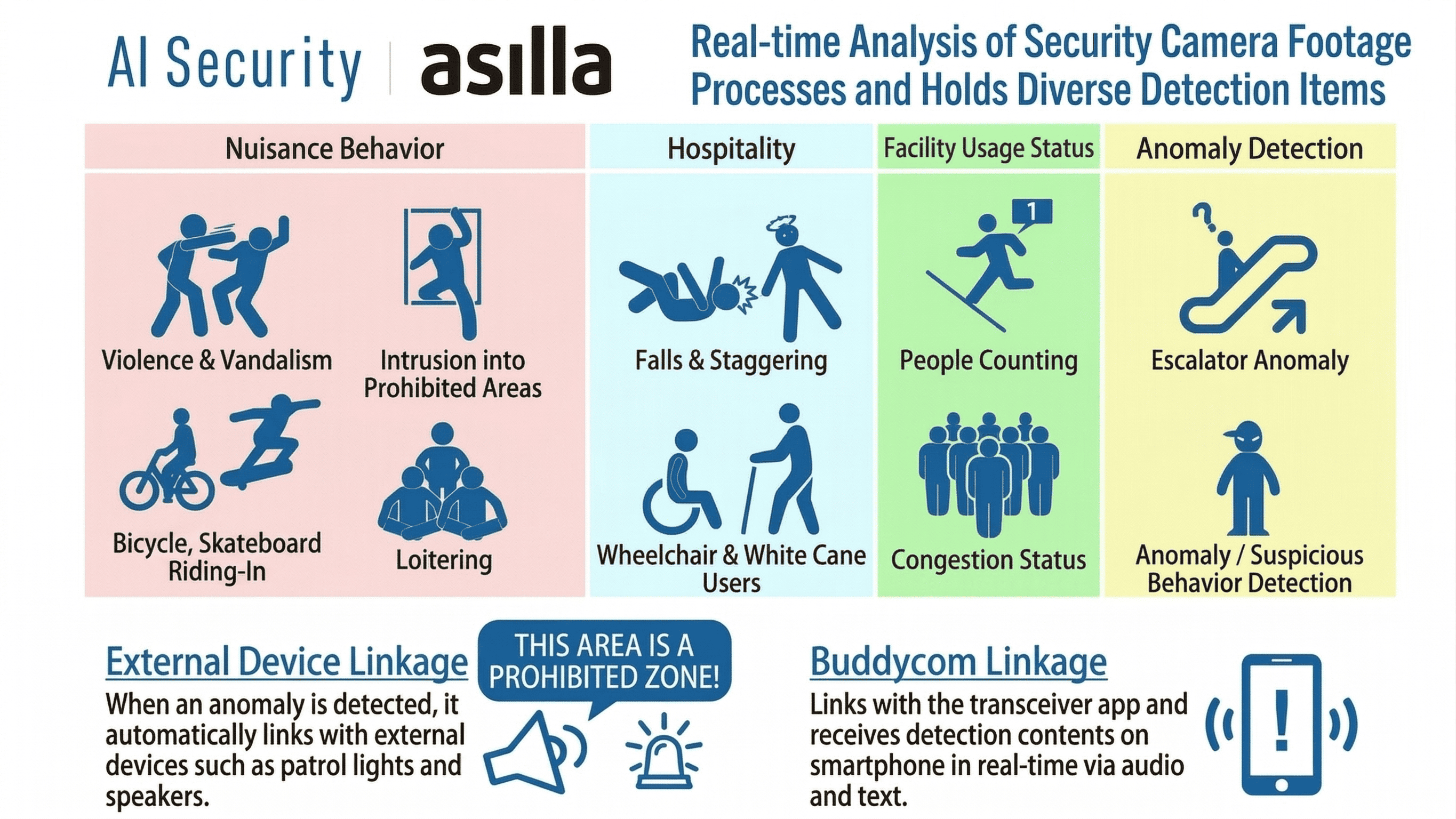 AI Security asilla analyzes existing security camera footage using AI to detect abnormal behaviors (violence, falls, intrusions) and concerning behaviors (loitering, crowding, signs of illness) in real time. With 24/7 AI monitoring, the system reduces the burden on security personnel while enabling faster and more accurate responses.