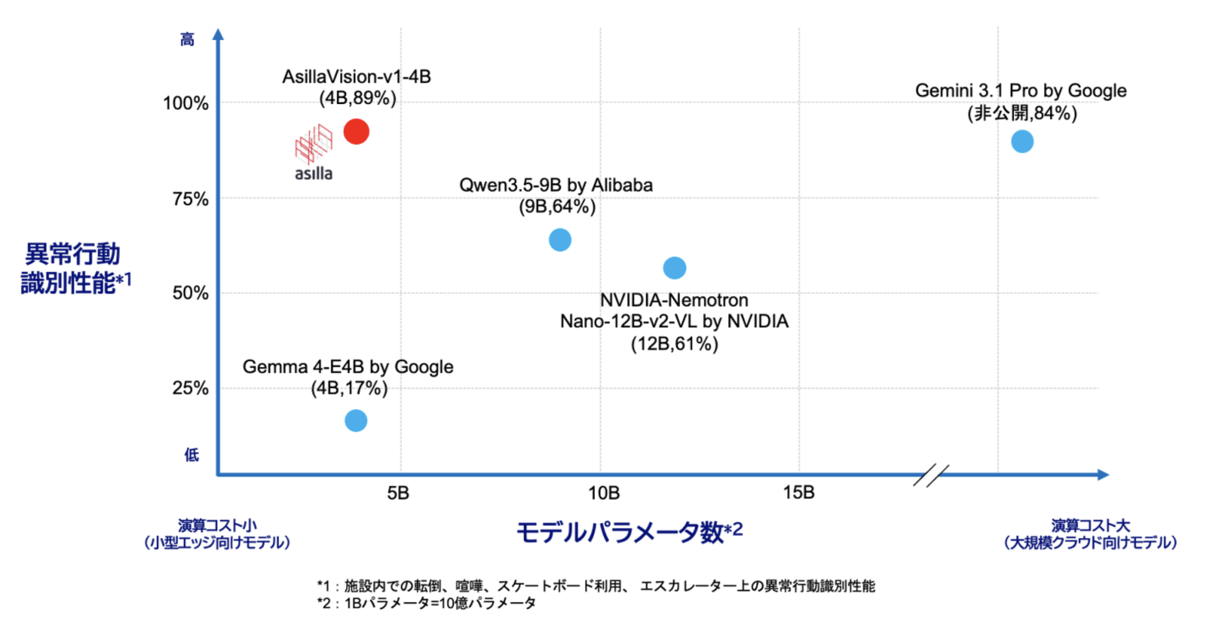 The model achieved 89% accuracy in identifying real-world anomalous behaviors such as falls, fights, and skateboard use within facilities, outperforming major VLMs including Google Gemini 3.1 Pro (84%), Alibaba Qwen3.5-9B (64%), and NVIDIA Nemotron Nano-12B-v2-VL (61%). *Based on Asilla's proprietary evaluation dataset.